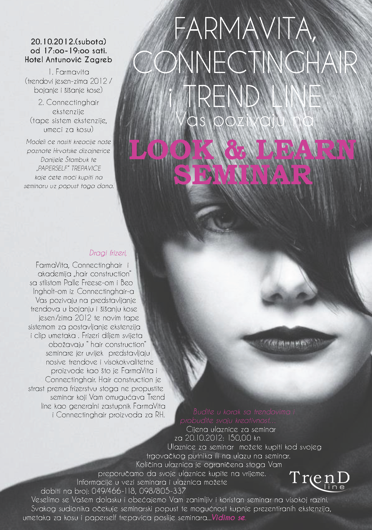 Dragi frizeri, FarmaVita, Connectinghair i akademija „hair construction“ sa stlistom Palle Freese-om i Beo Ingholt-om iz Connectinghair-a Vas pozivaju na predstavljanje trendova u bojanju i šišanju kose jesen/zima 2012 te novim tape sistemom za postavljanje ekstenzija i clip umetaka. Frizeri diljem svijeta obožavaju “hair construction“ seminare jer uvijek predstavljaju nosive trendove i visokokvalitetne proizvode kao što je FarmaVita i Connectinghair. Hair construction je strast prema frizerstvu stoga ne propustite seminar koji Vam omugućava Trend line kao generalni zastupnik FarmaVita i Connectinghair proizvoda za RH.