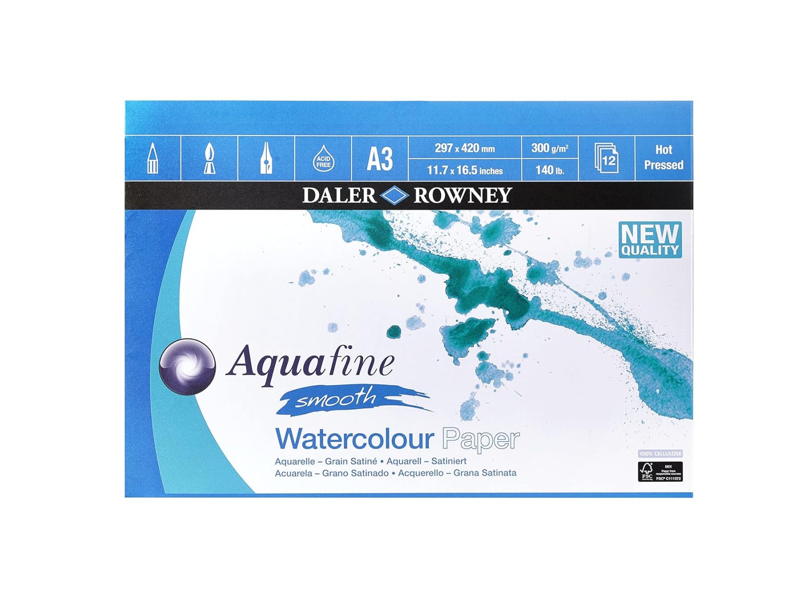 Akvarel blok Daler-Rowney Aquafine Smooth  za umjetnike svih razina, od početnika i studenata do profesionalaca. Ovaj visokokvalitetni papir dimenzija A3 (29,7 x 42 cm) i težine 300 gsm (140 lb) pruža idealnu podlogu za precizne i detaljne akvarel tehnike zahvaljujući glatkoj površini i vrhunskim materijalima.