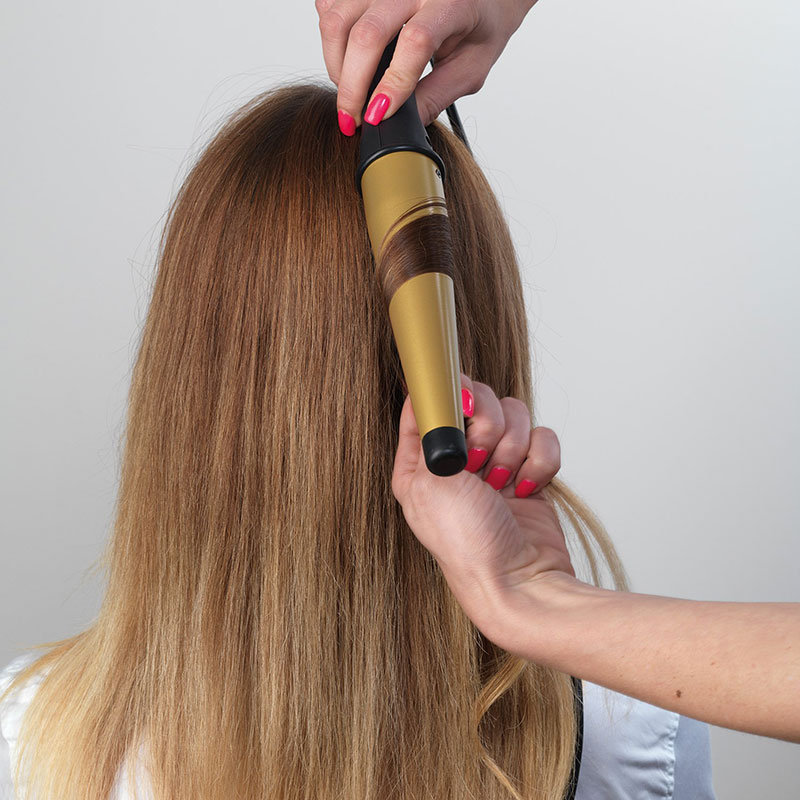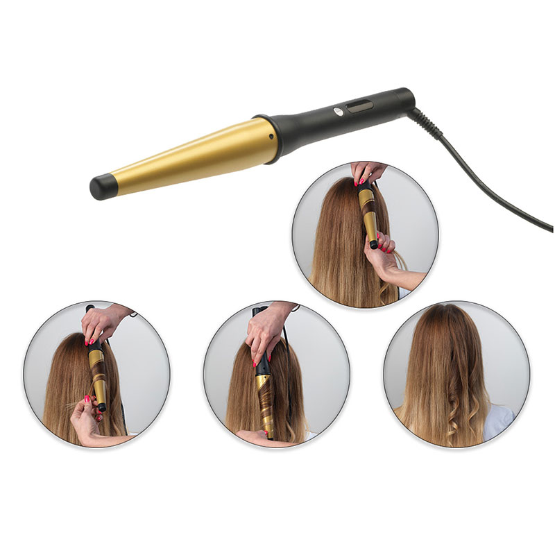 Oblikovanje kovrča: Uzmite pramen kose, omotajte ga oko konusne cijevi, držite nekoliko sekundi, a zatim otpustite.