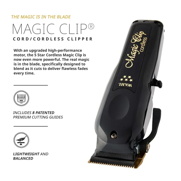 - Bežični rad s dugim trajanjem baterije – Wahl 5 Star Black Cordless Magic Clip omogućuje do 100 minuta rada s jednim punjenjem, dok se baterija puni u samo 60 minuta