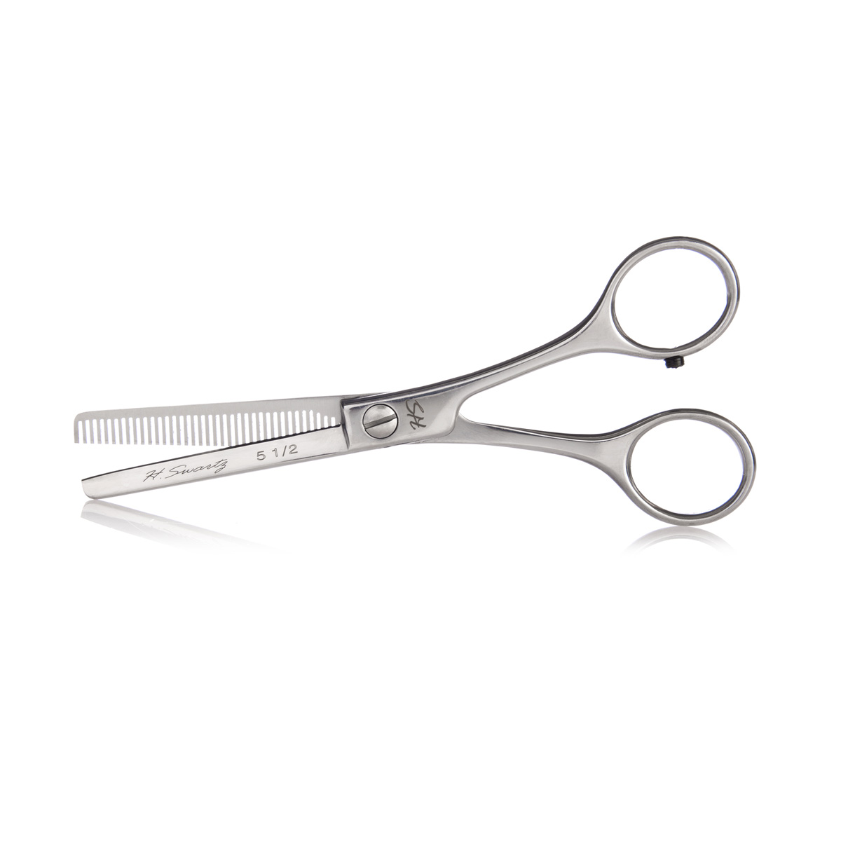 Efilir škare H. Swartz – 5.5”, 36 zuba, 1 oštrica dizajnirane su za profesionalno stanjivanje i oblikovanje kose u frizerskim salonima. S jednom klasičnom oštricom i drugim dijelom s 36 preciznih zuba, omogućuju ravnomjerno uklanjanje volumena i prijelaza u frizuri bez stvaranja oštrih linija.