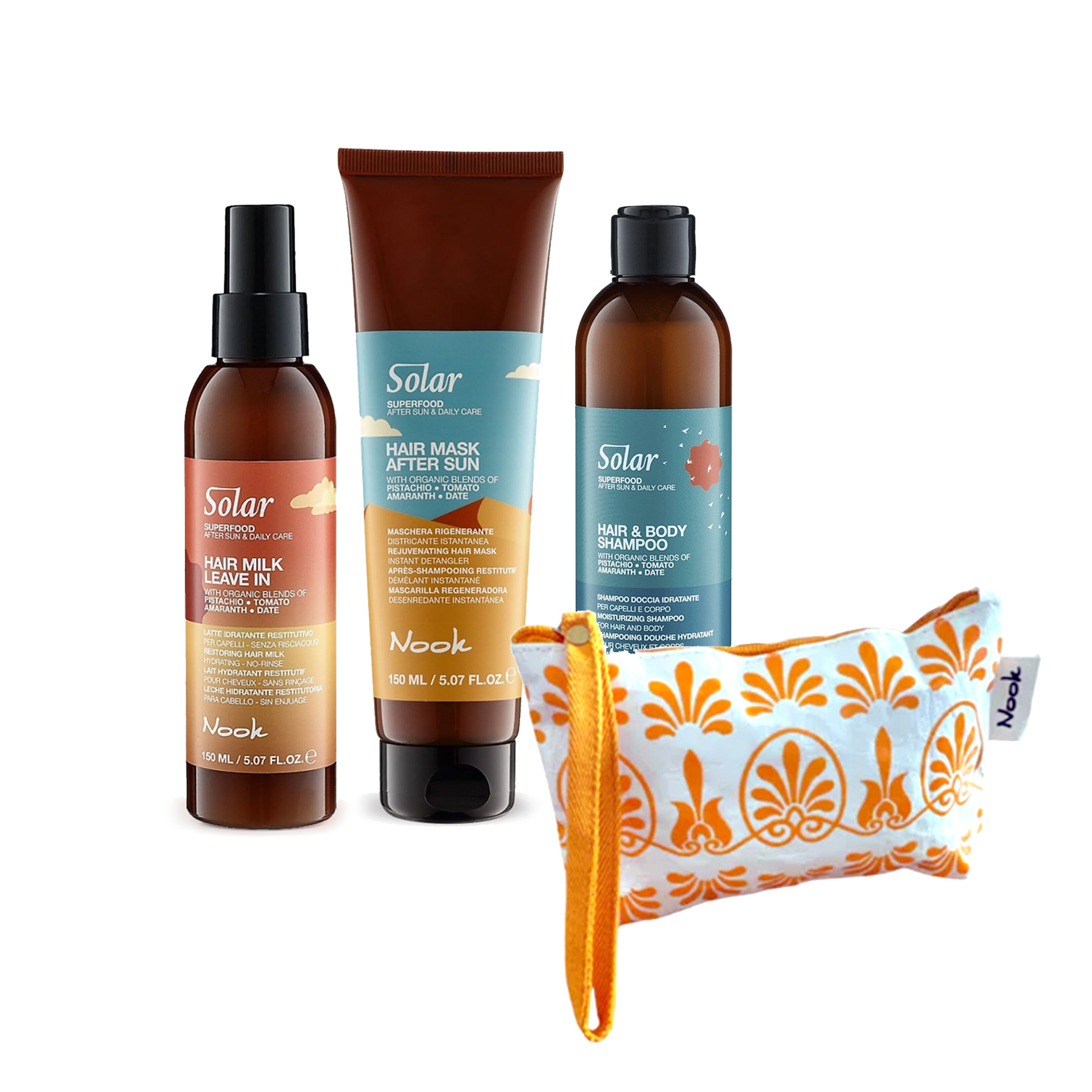 Sunce, more i sol mogu oštetiti kosu, ali uz pravi tretman možete spriječiti suhoću, lomljivost i gubitak sjaja. Nook Solar Superfood paket osigurava sve što je potrebno za potpunu ljetnu njegu – i više od toga. U ovoj varijanti uz set dolazi i praktična ljetna torbica na poklon – idealna za plažu, putovanja ili organizaciju vaših omiljenih proizvoda.