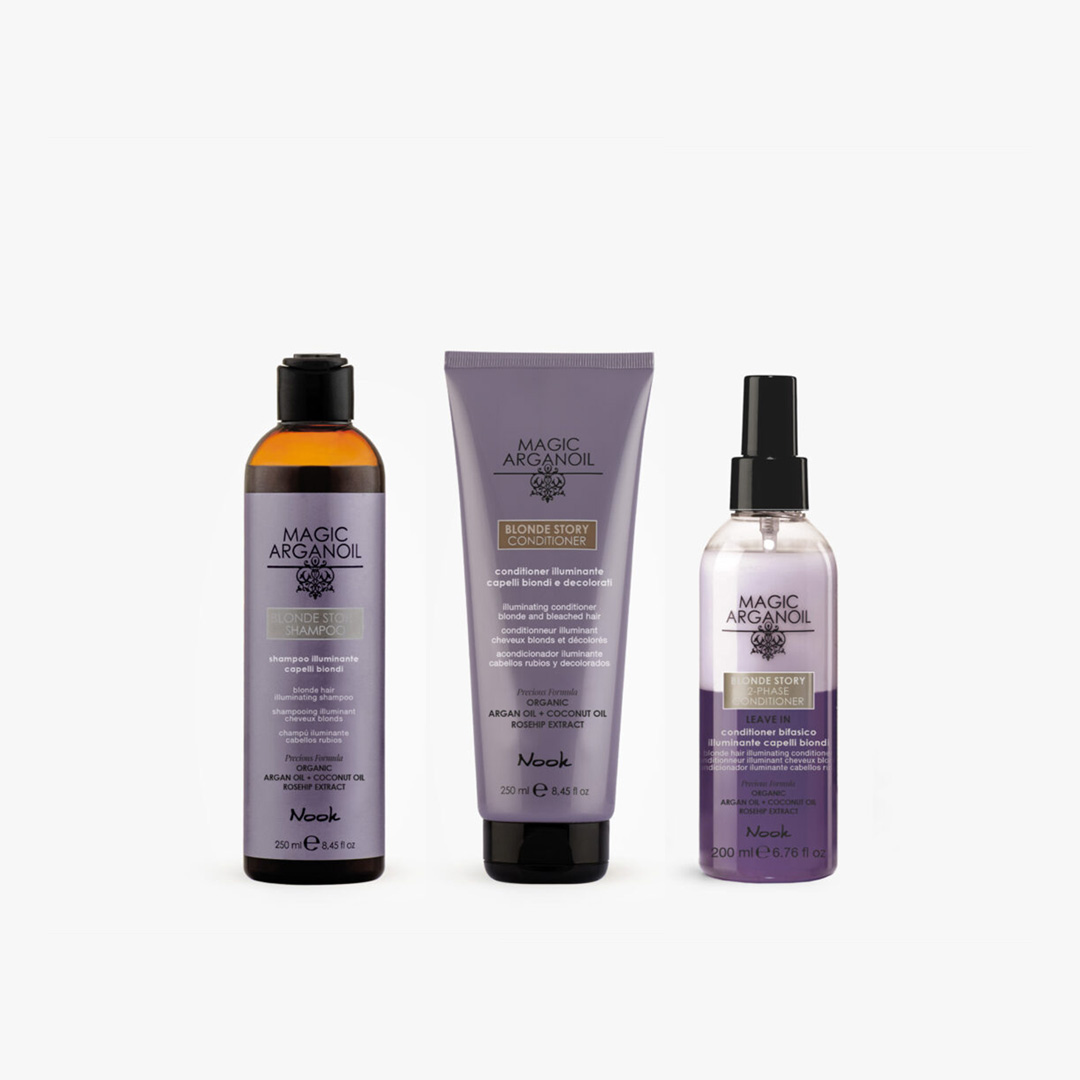 Nook Blonde Story paket pruža kompletnu njegu za plavu, dekoloriranu kosu te kosu s pramenovima, a odličan je i za sijedu ili bijelu kosu. Paket uključuje šampon, regenerator i dvofazni leave-in sprej, koji zajedno osiguravaju sjaj, mekoću i zdrav izgled kose.