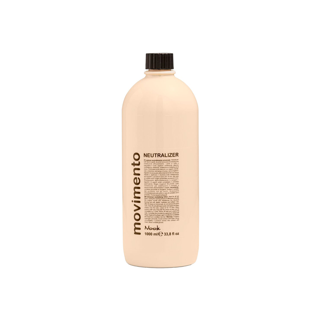 Nakon procesa ondulacije, NOOK Movimento Neutralizer stabilizira i fiksira novu strukturu kose. Njegova blago kisela pH vrijednost (5.0 – 5.5) vraća prirodnu ravnotežu vlasi, zatvara kutikulu i osigurava dugotrajnost postignutog oblika. Formula s keratinom pomaže obnoviti sumporne veze u kosi te ostavlja kosu hidratiziranom, elastičnom i sjajnom.