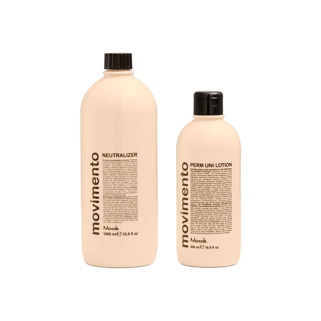 NOOK Movimento Perm Uni System inovativni je profesionalni sustav za trajnu ondulaciju u jedinstvenoj formuli, osmišljen za postizanje prirodnih, elastičnih i dugotrajnih valova uz maksimalnu sigurnost za kosu i vlasište. Ovaj univerzalni set za trajnu ondulaciju bez amonijaka prikladan je za sve tipove kose – prirodnu, obojenu i kemijski tretiranu, uključujući i osjetljivu kosu.