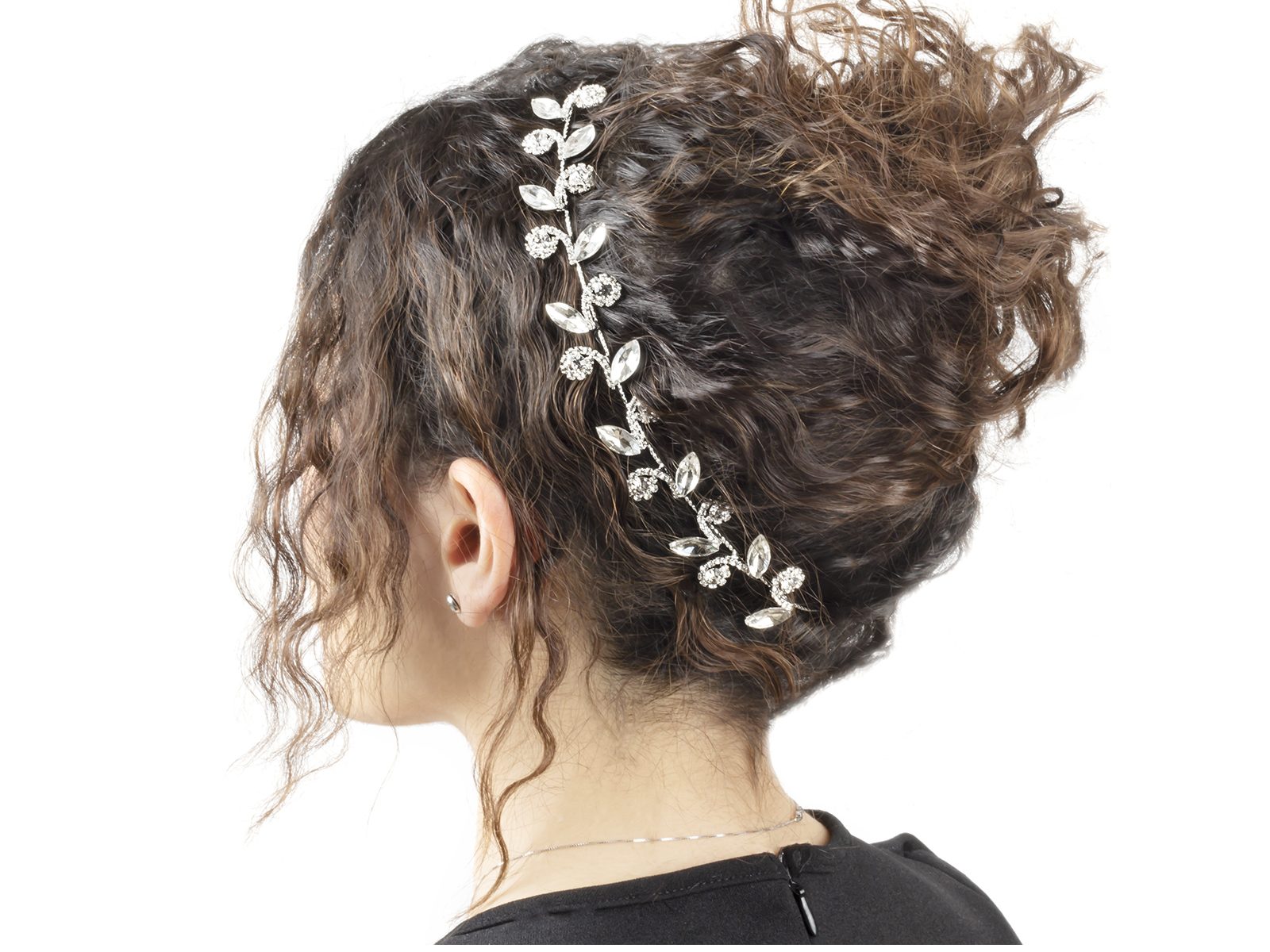 Dodajte dašak elegancije svojoj svečanoj frizuri ovim prekrasnim ukrasom za kosu. Ukras za kosu srebrne boje, dužine 28 cm ima cvjetiće ukrašene svjetlucavim cirkonima. Ovaj luksuzni dodatak frizuri prilagodljiv je svakom stilu svečanih frizura i može se nositi na više načina.