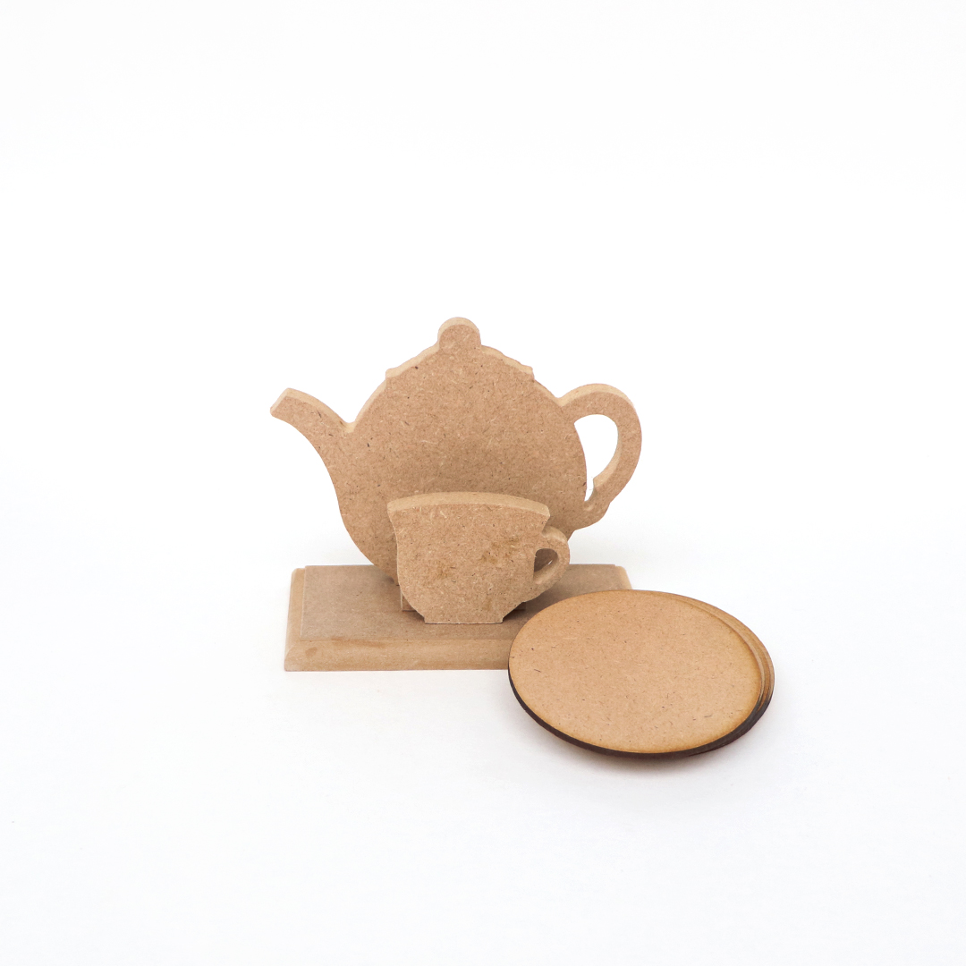 MDF stalak u obliku čajnika i 6 okruglih podmetača za čaše promjera 9,5 cm.