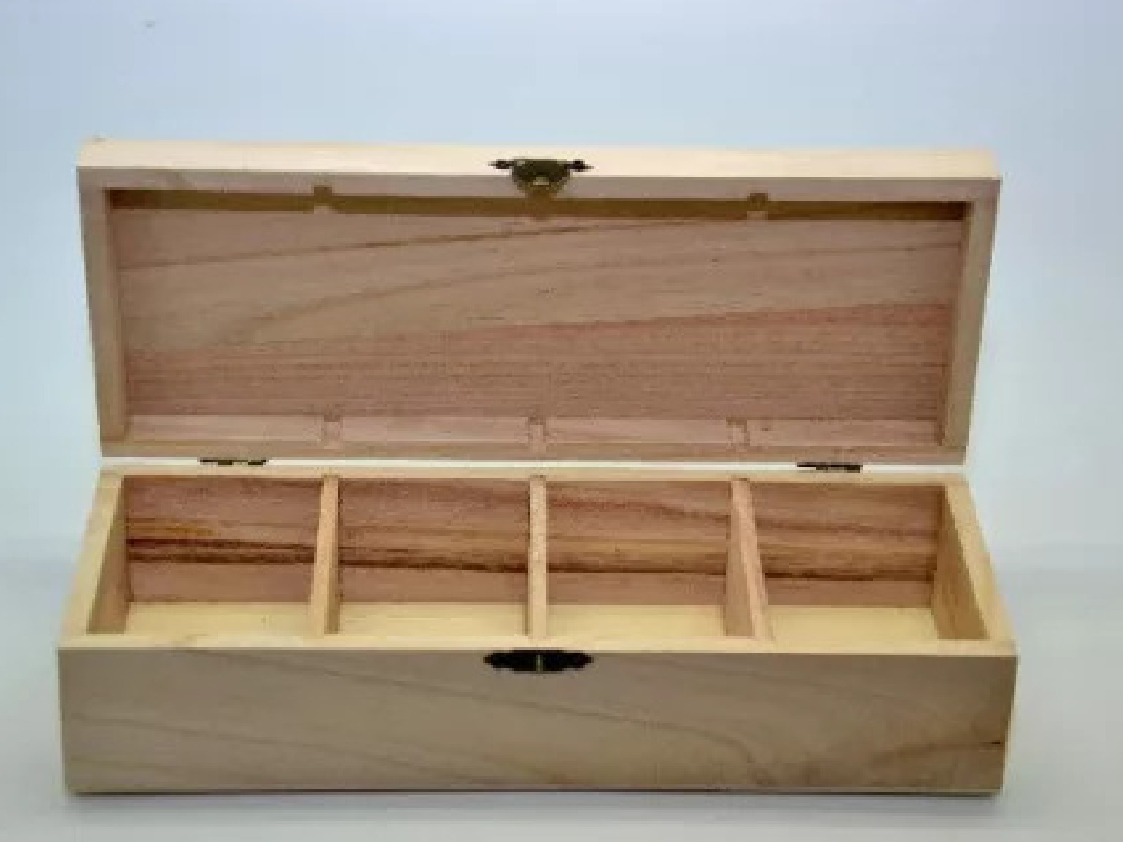 Drvena kutija s pretincima – savršen organizacijski set za vaše dragocjene sitnice! Kompaktna i malih dimenzija, ova kutija pruža elegantno rješenje za organizaciju vaših predmeta. Kutija ima 4 pretinca, poklopac i dimenzije je 25 x 9.5 x 6.7 cm.