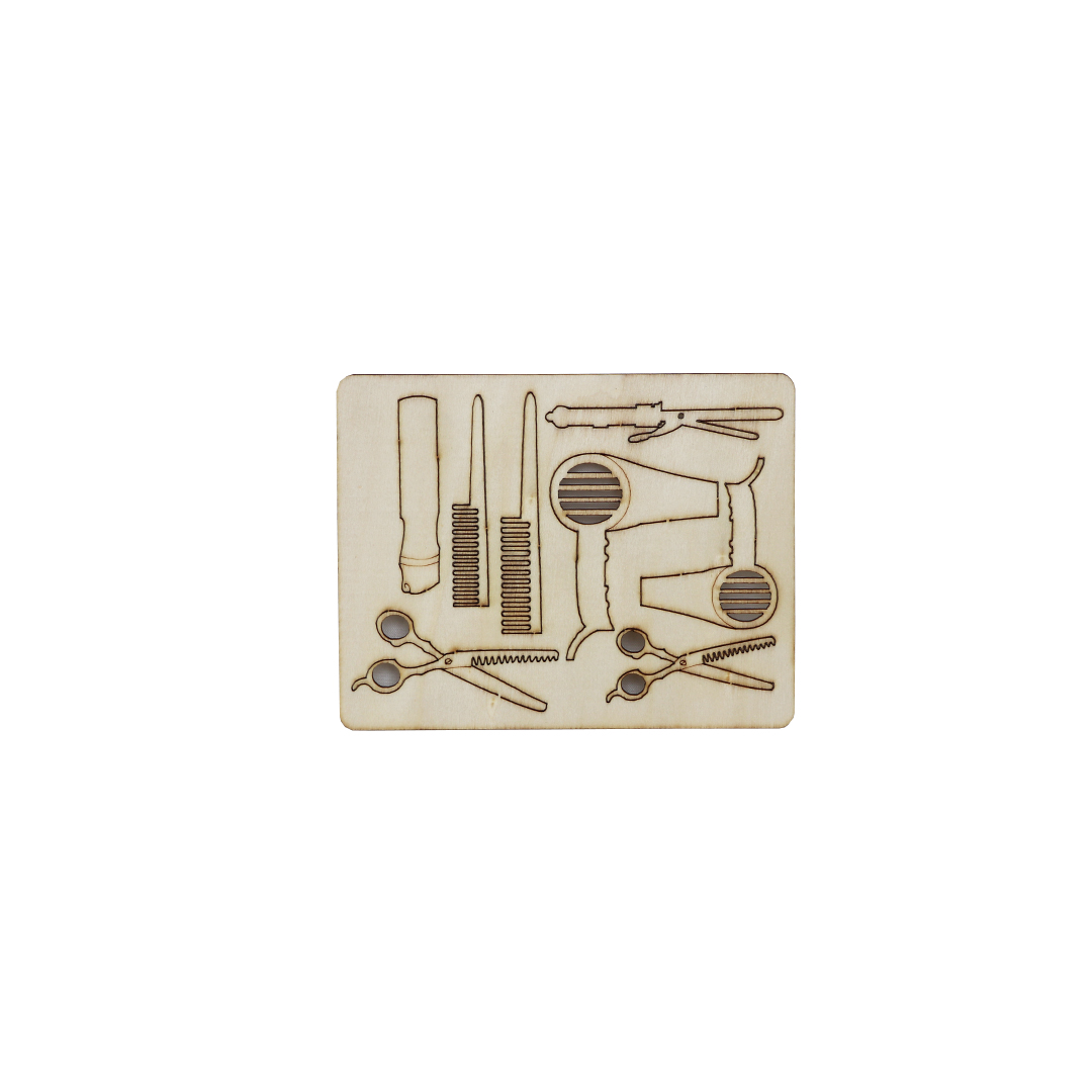 Frizerski pribor laserom izrezan iz drva, mini. Dimenzija cijele pločice je 9×11,5 cm. Na pločici se nalaze laserom izreazane dvoje škare, dva sušila za kosu, figaro, dva češlja i lak za kosu.