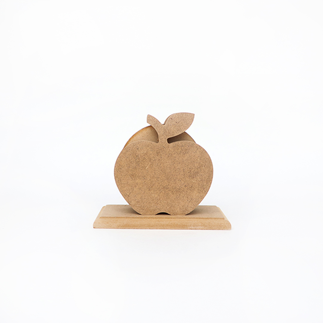 MDF stalak u obliku jabuke i 6 okruglih podmetača za čaše promjera 9,5 cm.