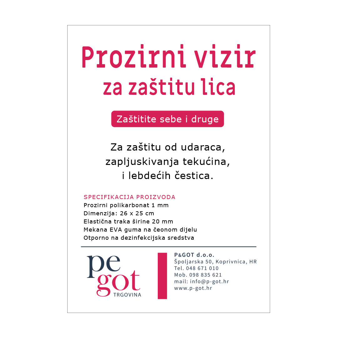 Vizir za zaštitu lica, prozirni. Za zaštitu od udaraca, zapljuskivanja tekućina i lebdećih čestica.
